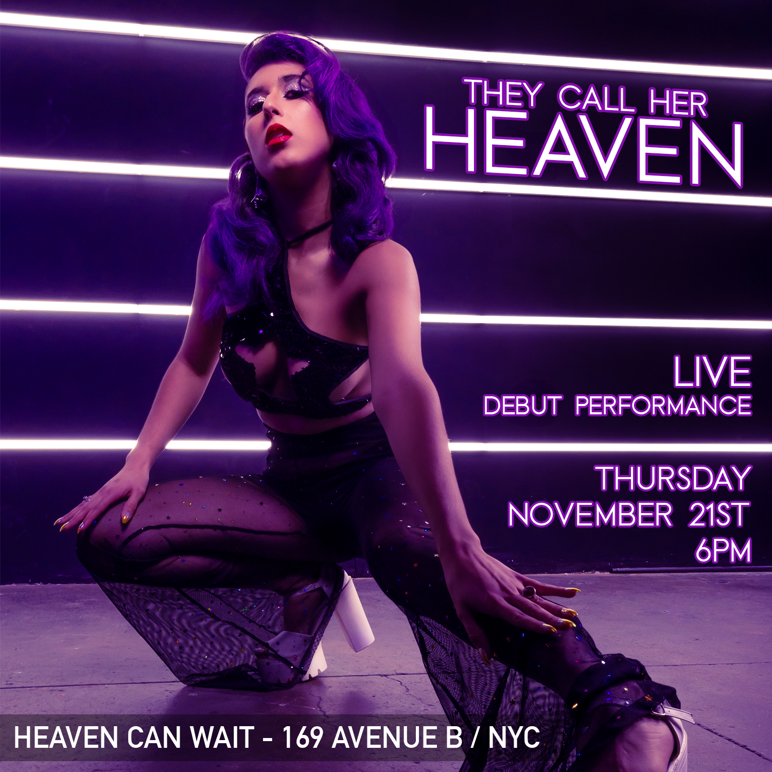 The debut performance of "They Call Her Heaven" at Heaven Can Wait in NYC! November 21st, 2024 7pm Date and time: Thur, Nov 21st, 2024, 7pm Add to calendar Location: Heaven Can Wait 169 Avenue A, NYC...